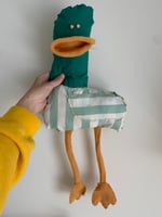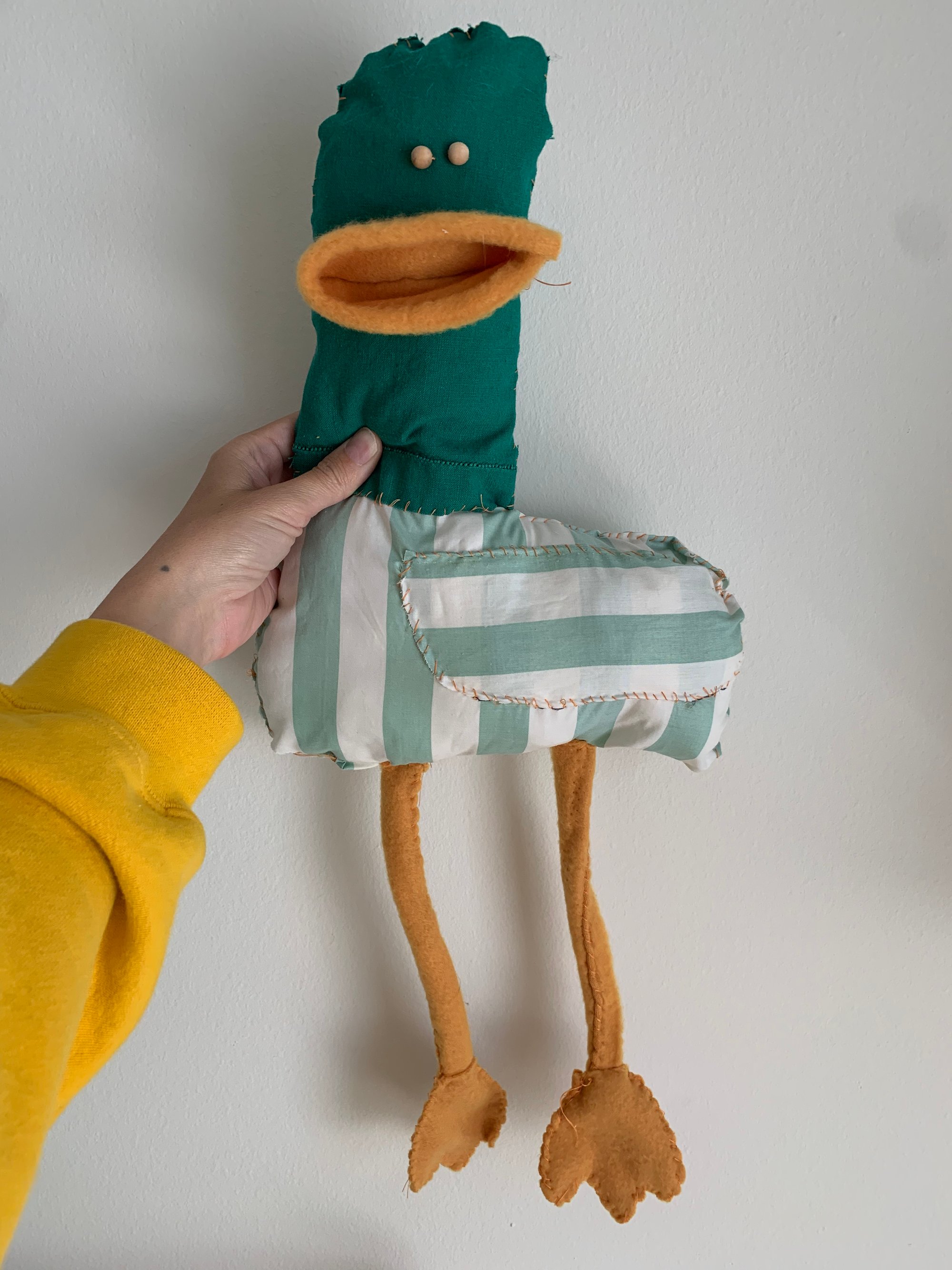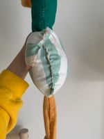 Hand sewn using scrap fabrics :) wooden bead eyes, about 22” long