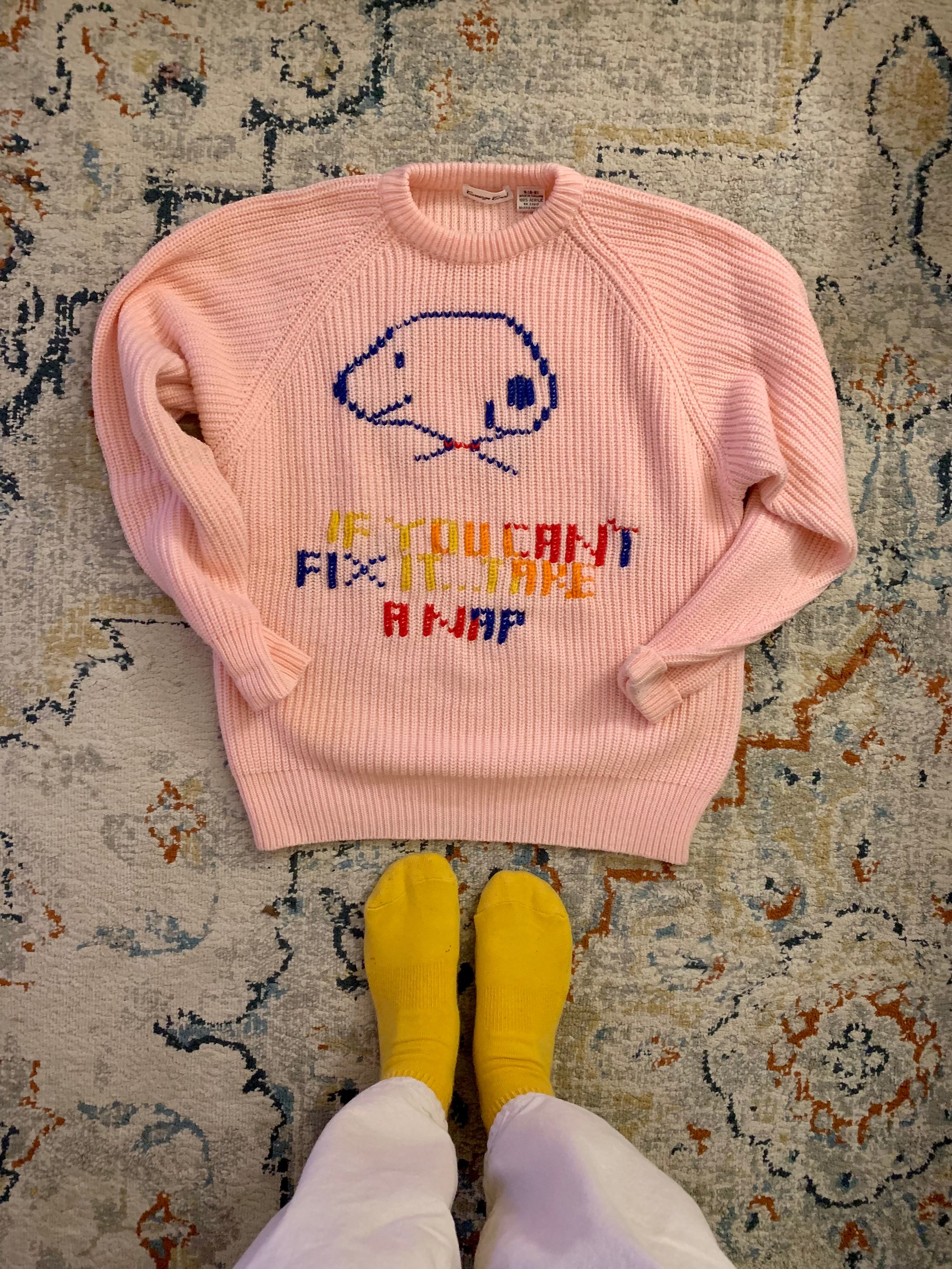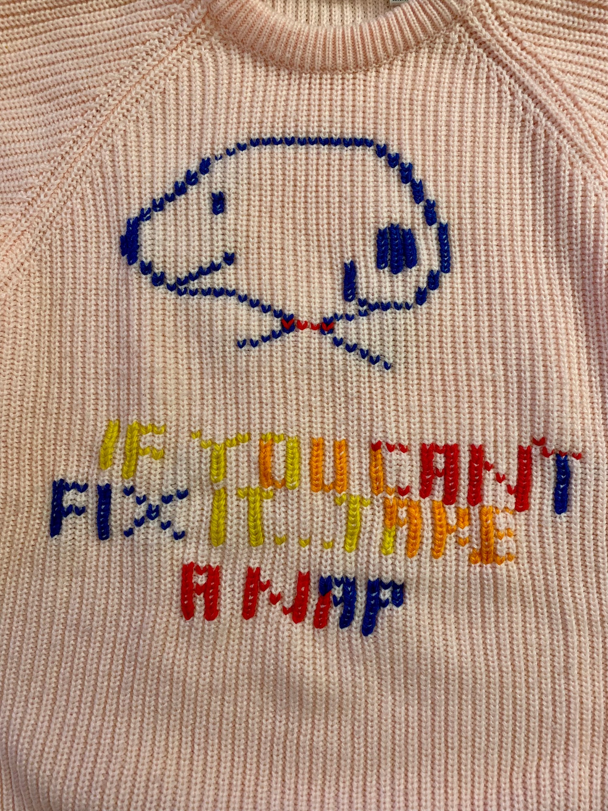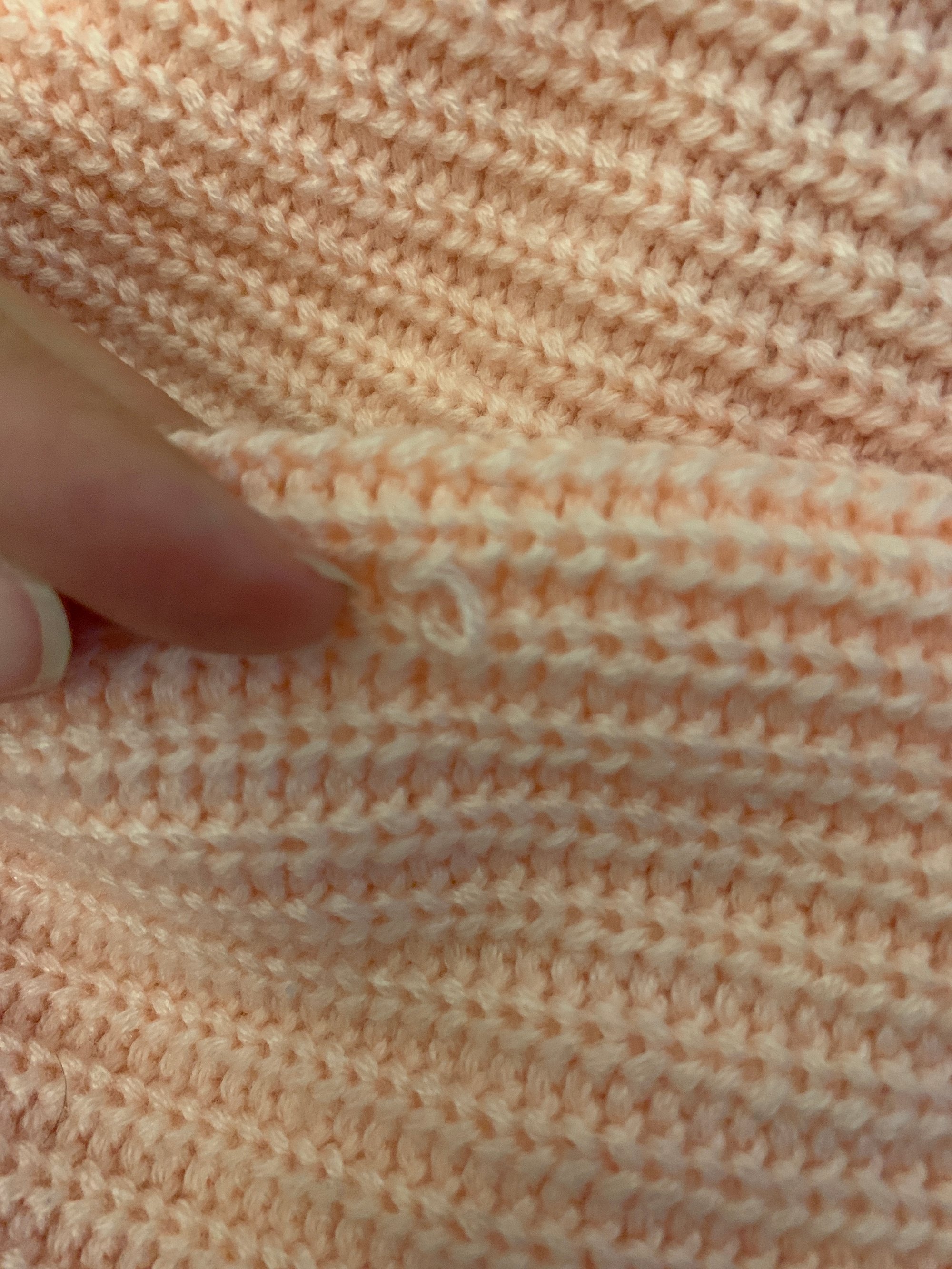 Duplicate stitch on a tagged size Small 100% acrylic sweater// the pink is most like the first picture:-) there’s a small snag (x2) on the left arm (see pictures)